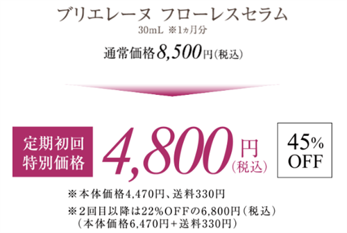 ブリエレーヌフローレスセラム導入美容液を定期購入すると、初回購入時に通常価格の45%オフで購入でき、4,800円(税込)でお試しいただけます。