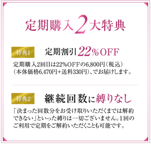 また、2回目以降も22%オフの6,800円(税込)で継続購入が可能です。