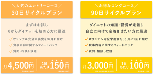 A:ガレイドウェルネスクラブには「30日サイクルプラン」と「90日サイクルプラン」の2種類があります。