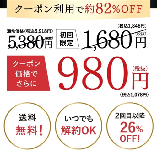 | 初回限定価格 | 1,848円(クーポン利用で1,078円) | 約82%OFF、初回限定特典 |