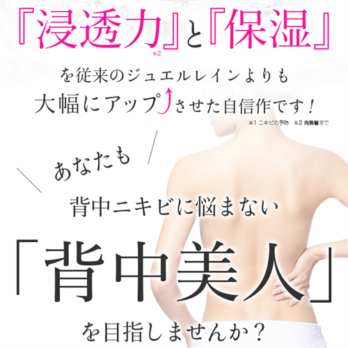 ジュエルレインは、背中ニキビをはじめとした肌トラブルに効果的なケア製品です。