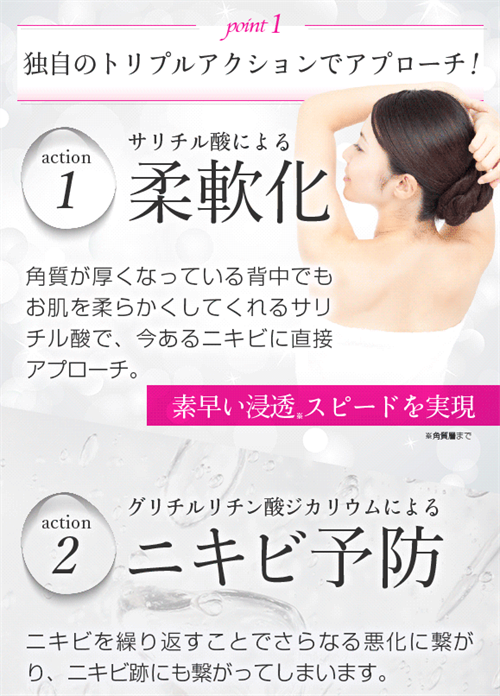 特に、背中ニキビに特化したケア製品として、他の製品とは一線を画す独自の浸透技術「ナノBテクノロジー3.0」を搭載しており、角質層の奥深くまで有効成分がしっかり届きます。