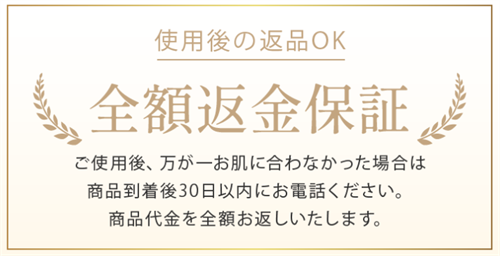 使用後、万が一肌に合わなかった場合でも、商品到着後30日以内に連絡すれば、商品代金を全額返金いたします。