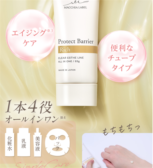 A:はい、マキアレイベル プロテクトバリアリッチcは化粧水・乳液・美容液・パックの4役を1つでこなすオールインワンジェルです。