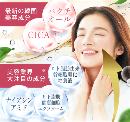 バクチオールやCICA、ヒト幹細胞培養液といった高機能成分を贅沢に配合し、角質層まで美容成分をダイレクトに届けることで、ハリ・ツヤ・透明感のある肌へと導きます。