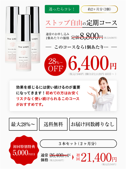 3本セット定期コースは、2ヶ月分のレチノビオローズをまとめて購入するプランで、長期的に使用することを考えている方に最適です。