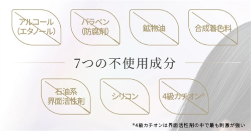 - アルコール・パラベン・鉱物油・合成着色料・石油系界面活性剤・シリコン・4級カチオン不使用