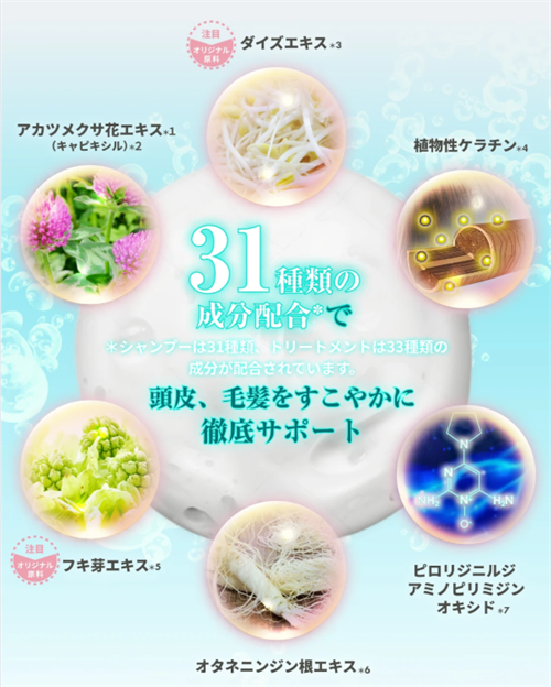 トリートメント成分: 水、セテアリルアルコール、ステアラミドプロピルジメチルアミン、グリセリン、ジメチコン、ベヘナミドプロピルジメチルアミン、乳酸、セタノール、シア脂、テトライソステアリン酸ペンタエリスリチル、セバシン酸ジエチル、イソステアリルアルコール、BG、イソステアリン酸水添ヒマシ油、ミリスチン酸ミリスチル、香料、フェノキシエタノール、PPG-4セテス-20、ポリクオタニウム-10、ポリクオタニウム-7、(加水分解シルク/PGプロピルメチルシランジオール)クロスポリマー、γ-ドコサラクトン、ダイズ根/芽エキス、安息香酸Na、ペンチレングリコール、ココイル加水分解ケラチンK、オタネニンジン根エキス、フキ芽エキス、ピロリジニルジアミノピリミジンオキシド、デキストラン、アセチルテトラペプチド-3、アカツメクサ花エキス