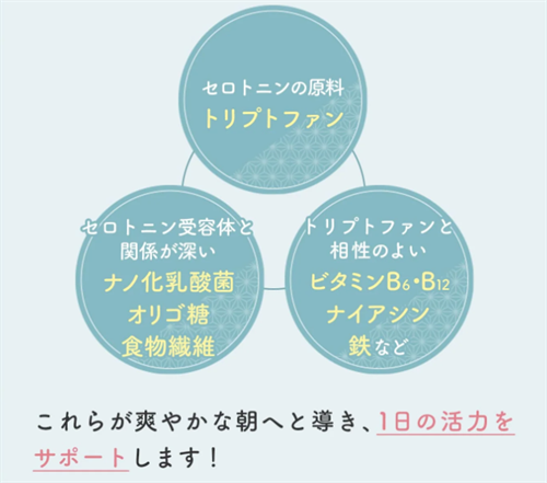 セロトニンをサポートする成分が豊富に含まれており、特に「トリプトファン」に加えてビタミンB群や乳酸菌なども摂取できるため、体と心の両方から元気をサポートします。