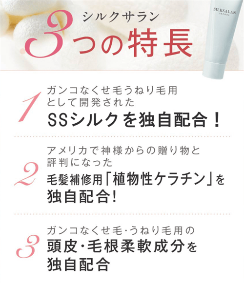 独自の「SSシルク」は、髪の主成分であるタンパク質に深く関わる高純度アミノ酸を豊富に含んでおり、スカスカで傷んだ髪を補修してくれます。