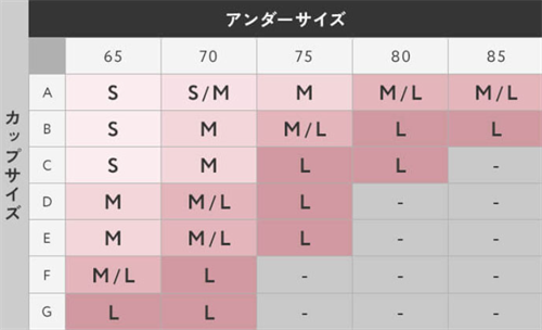 トップバストとアンダーバストを正しく測定した後、以下のサイズ表に従って選んでください。